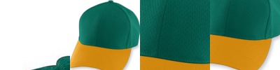 100% polyester athletic mesh with tricot backing Six panels Low profile pro-style crown Fused buckram-backed front panels Matching sewn eyelets Pre-curved bill with contrast grey undervisor Hook-and-loop fastener