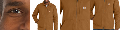 Classic Carhartt style meets Carhartt durability in this coat which features our signature cotton duck fabric for a tough exterior and a soft sherpa lining for warmth and comfort. 12-ounce, 100% ring spun cotton washed duck 100% polyester filling Sherpa-lined body for warmth Quilted-nylon lined sleeves for easy on-and-off Under-collar snaps for optional hood (sold separately) Pleated bi-swing back for additional range of motion Left chest pocket with zipper closure Two interior pockets Two large, sherpa-lined handwarming front pockets Interior rib knit storm cuffs help keep out the cold Carhartt-strong, triple-stitched main seams for added durability Carhartt label sewn on left pocket Loose fit