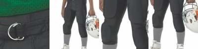 13 oz./yd², 100% double knit polyester Five panel construction with traditional duke crotch Five sewn-in perforated Eva pads with stretch mesh pad pockets (hip, knees and tail) Two thigh pads with plastic inserts Attached self-material belt with chrome rings Cover seamed throughout Entire pant is washable This product meets the following Sustainable Style subcategory:
