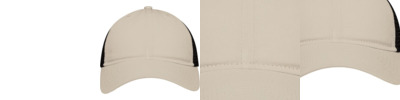 100% chino twill 100% polyester mesh back Heavy garment + softener wash Unstructured, six-panel, low-profile Pre-curved visor, undervisor will match mesh color COOLMAX moisture-management sweatband Tri-glide closure